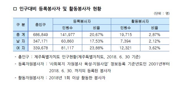 제주특별자치도 자원봉사현황(2018. 6. 30 기준)