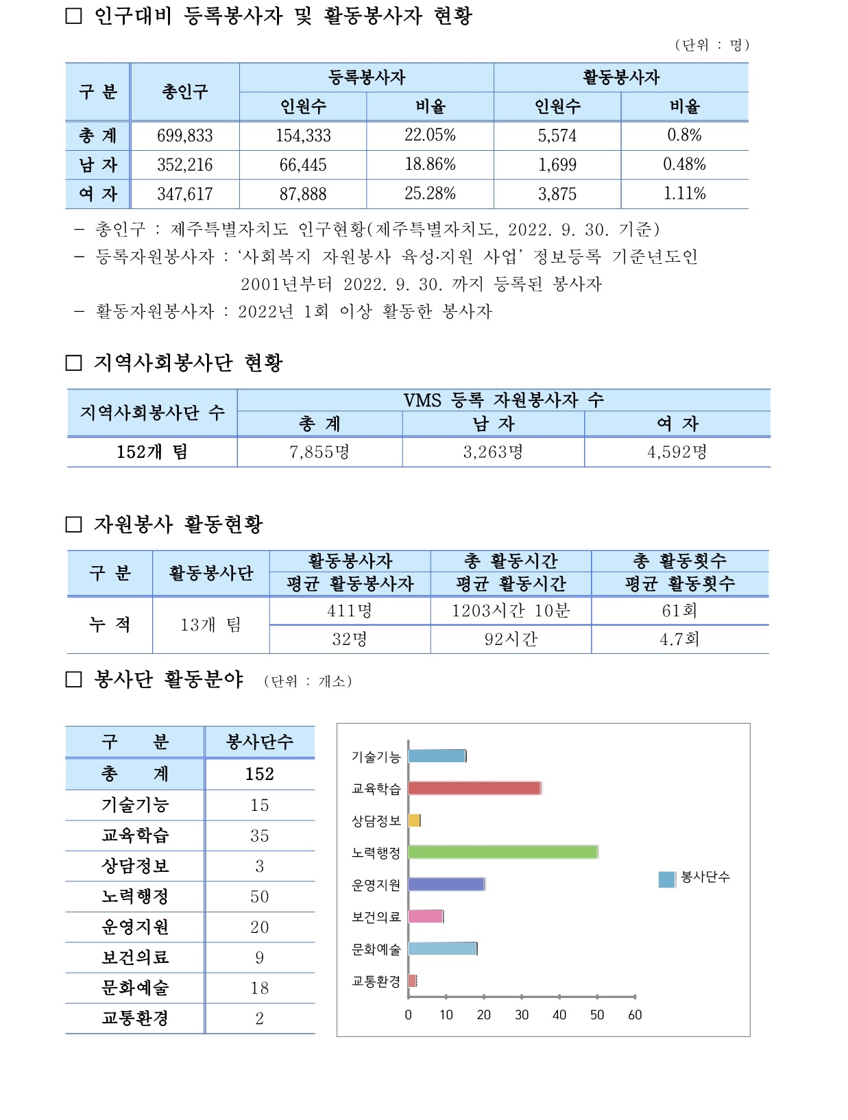 제주특별자치도 자원봉사현황 (2022. 9. 30 기준)