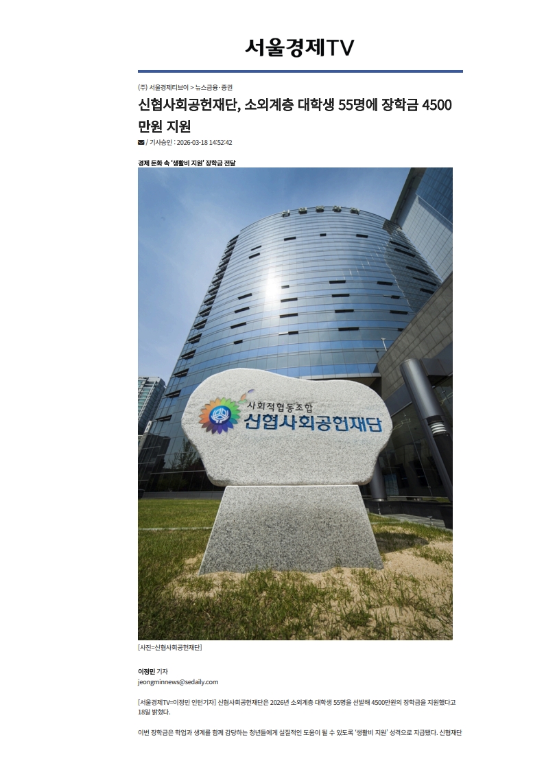 사회공헌기사 신협사회공헌재단, 소외계층 대학생 55명에 장학금 4500만원 지원