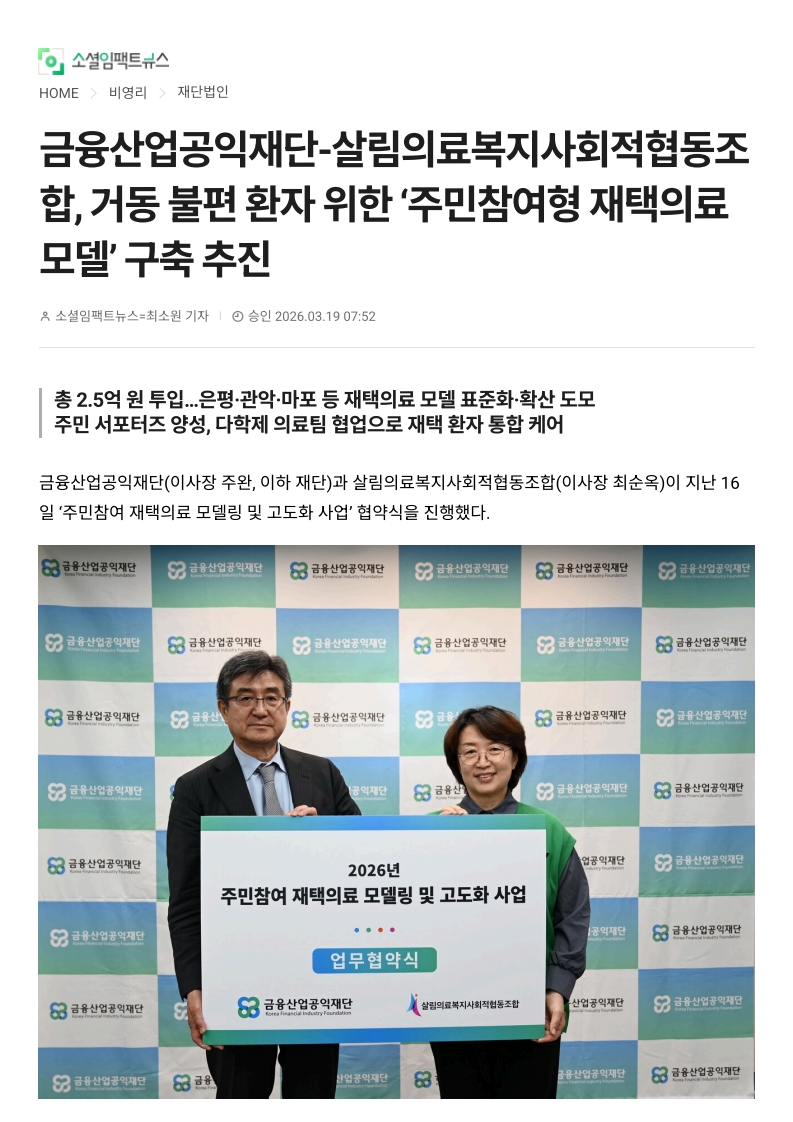 사회공헌기사 금융산업공익재단-살림의료복지사회적협동조합, 거동 불편 환자 위한 ‘주민참여형 재택의료 모델’ 구축 추진