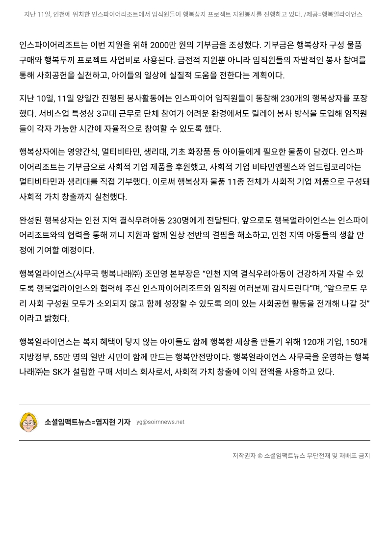 사회공헌기사 행복얼라이언스-인스파이어, 인천 지역 결식우려아동 위한 나눔 실천