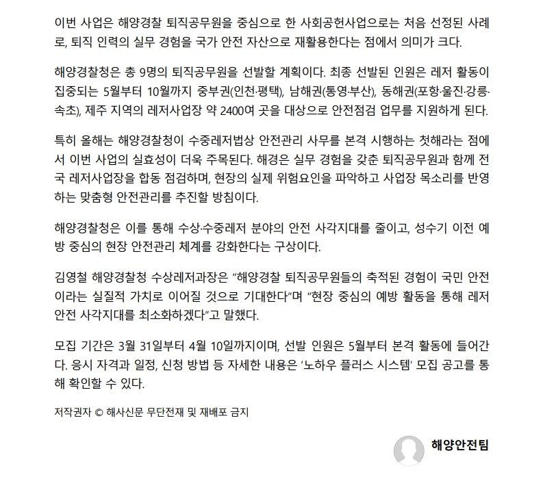 사회공헌기사 “퇴직 해경 경험, 레저 안전 현장에 투입”… 해경청, 사회공헌사업 참여자 모집