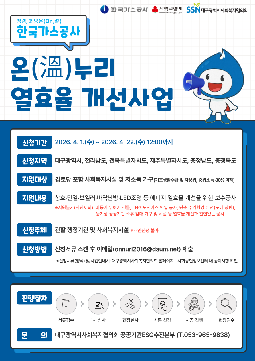 사회공헌공모 2026년 온(溫)누리 열효율 개선사업 홍보 및 참여자 모집 (경로당 포함 사회복지시설 및 저소득 가구)